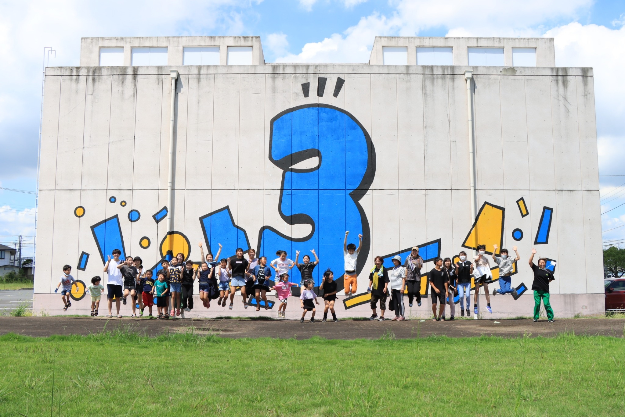 いば3ふるさとサポーターズクラブのサポーターとボランティアで描いた大壁画の前でジャンプ!もしましたね